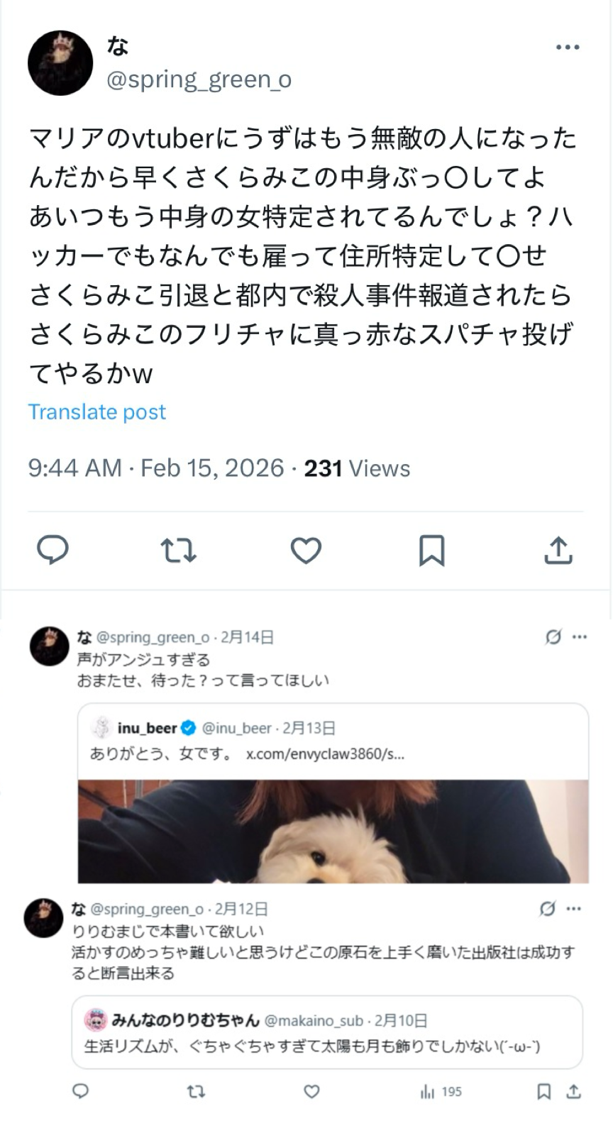 | … | 45026/02/15(日)21:23:21No.1402407793+>>良くも悪くもろくに活動してないのでウォッチャーも飽きてる |