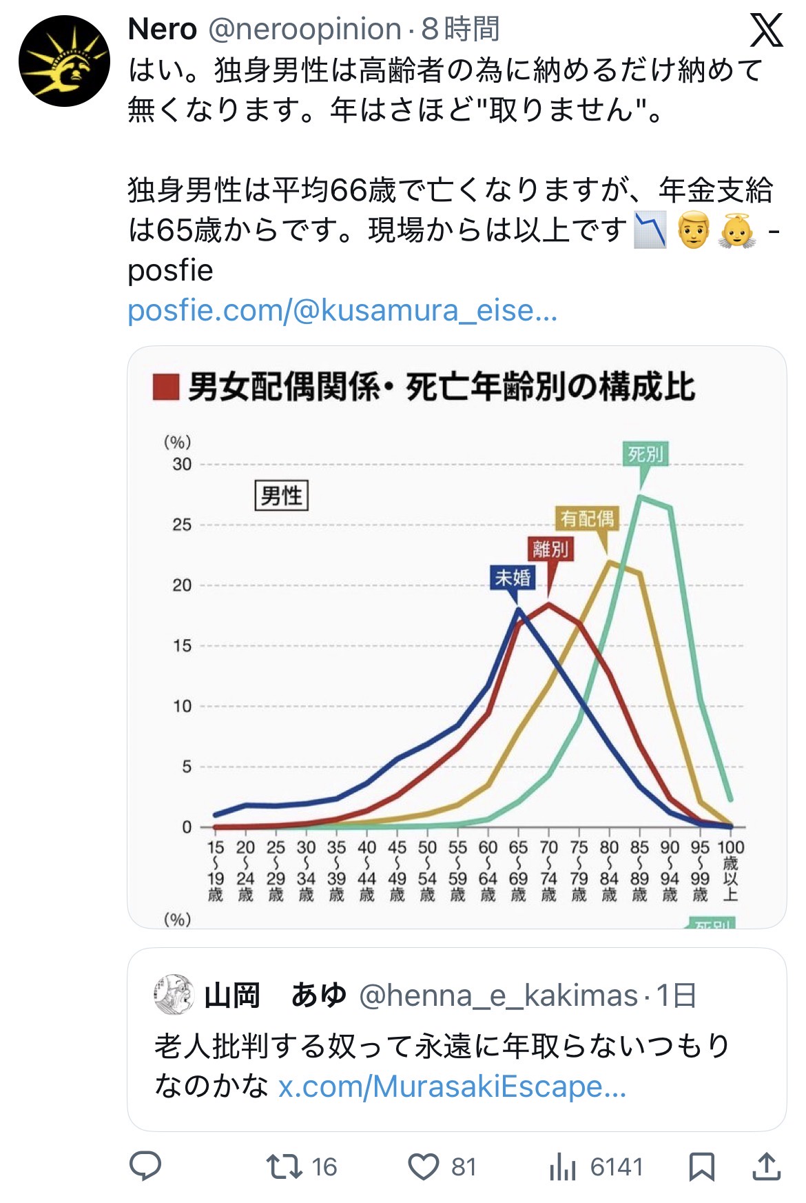 | … | 1826/02/16(月)07:06:58No.1402502194そうだねx4あくまで独身男性の「平均」が「66歳」だから |