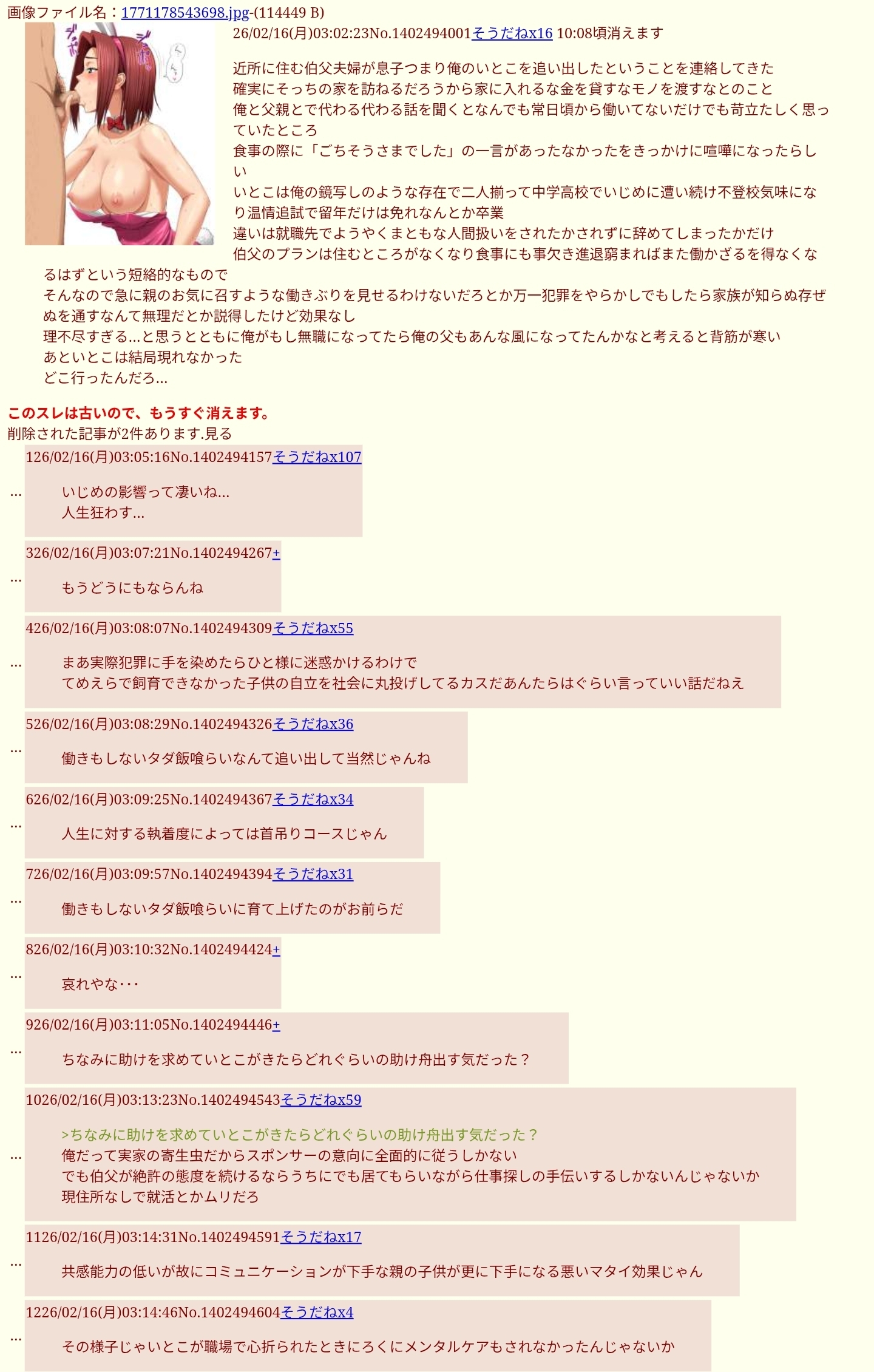 | … | 9726/02/16(月)19:14:01No.1402651779+追い出されたいとこが立てたスレ |