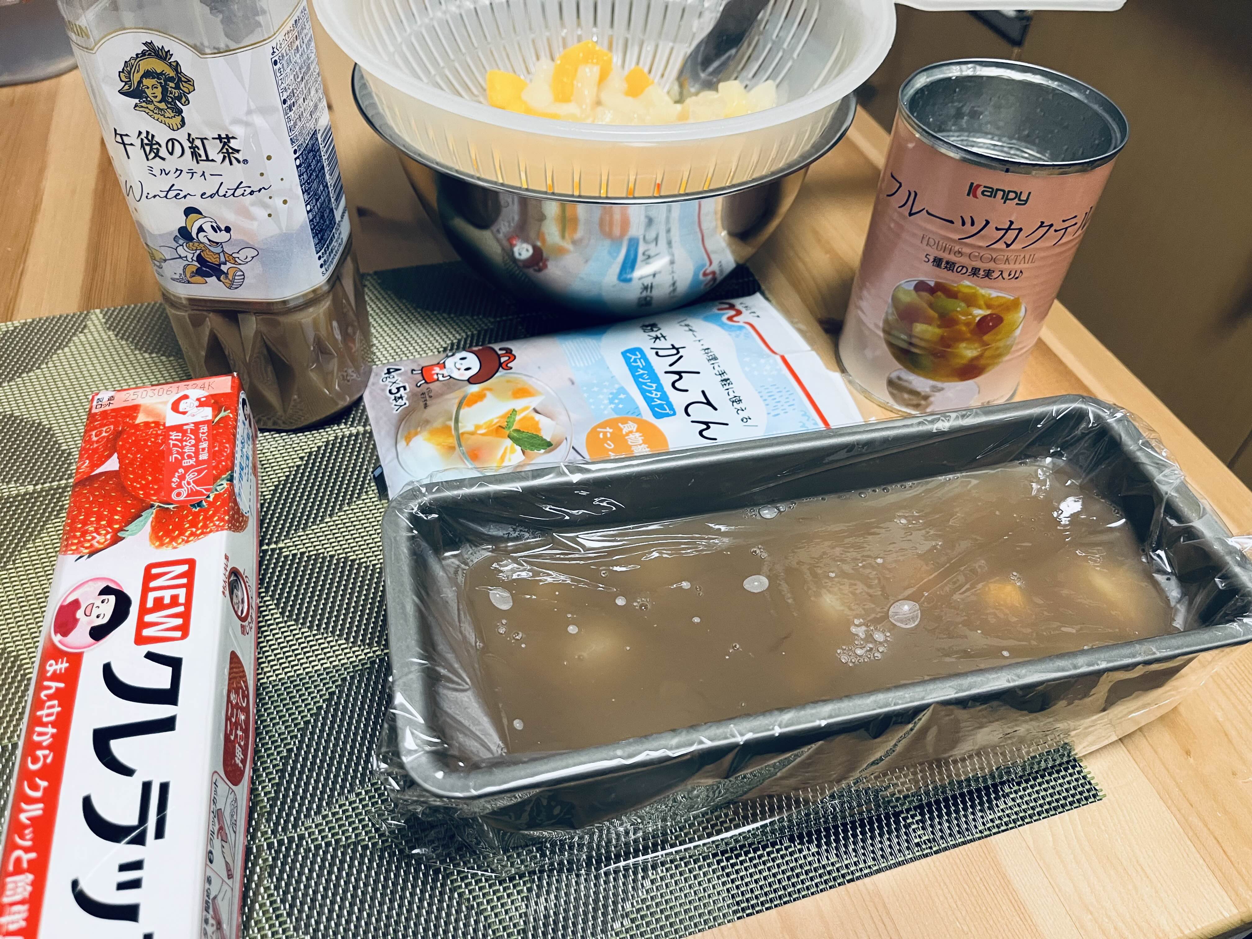 基本のホール型・おかずカップ型フルーツ牛乳寒天とパウンド型ミルクティー寒天のセットになります