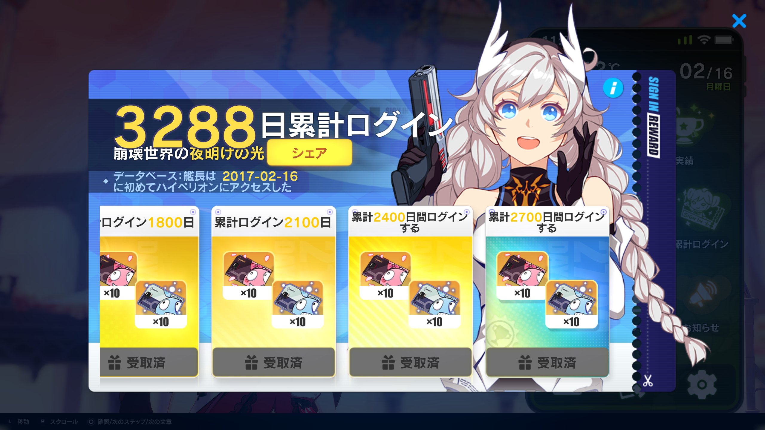 | … | 1626/02/16(月)21:14:23No.1402700882そうだねx4記念に累計ログイン撮ってきた!いつの間にか1000日超えてた! |