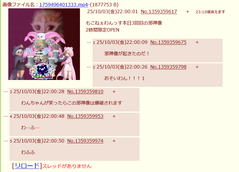 | … | 4526/02/16(月)22:10:28No.1402722533+何度でも蘇るわん!邪神の名のもとにわん! |