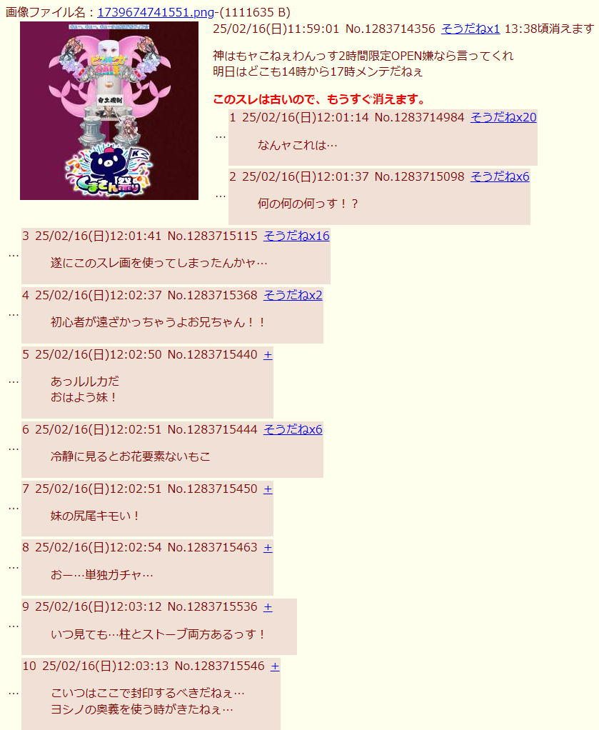 | … | 39526/02/16(月)23:06:38No.1402746271+そして明日が2/17でくまさん祭り開催1周年記念っすね |