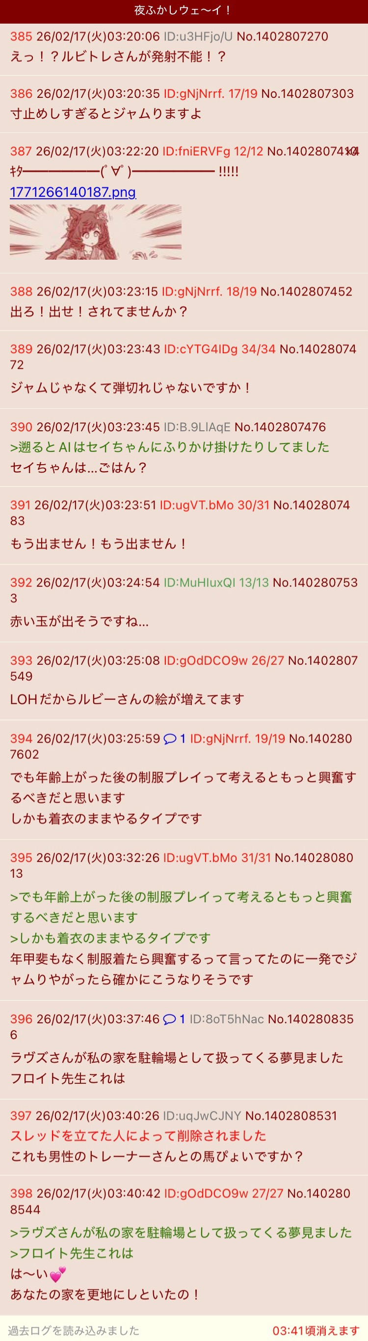| … | 5126/02/17(火)01:06:12No.1402790363+>>>急になんか発狂してる人がいて怖いです |