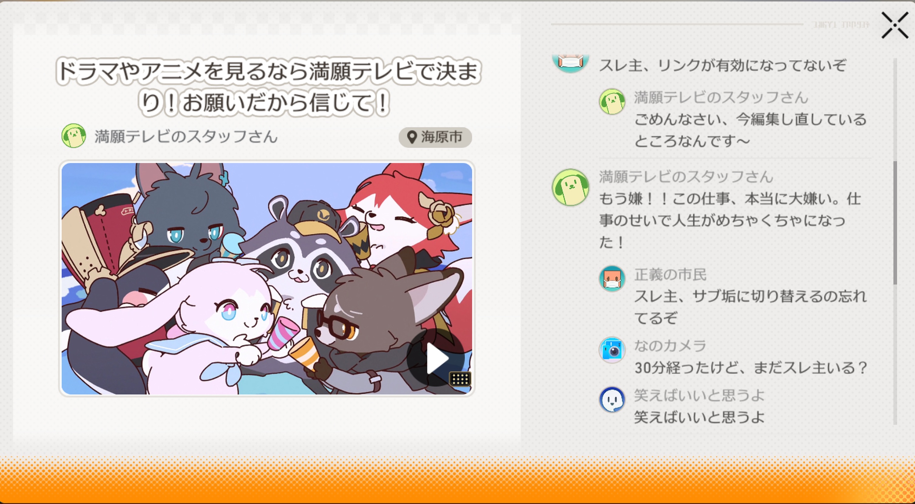 | … | 7426/02/17(火)12:47:47No.1402879287そうだねx1グダった身内ノリサークルと思うとサンポちゃんだいぶ面白さ頑張ってる |
