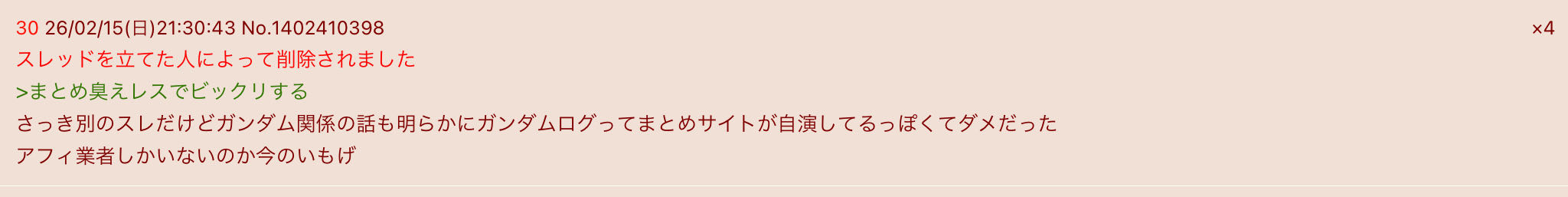 | … | 41926/02/17(火)15:21:51No.1402916679そうだねx2>流石にガンダムログが叩かれてレス加速するのは分かり安すぎない? |