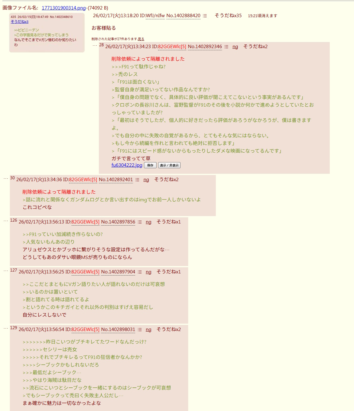 | … | 41026/02/17(火)15:20:33No.1402916384+>禿はF91語る時に必ずシーブックとセシリーは失敗って話から始まるんだよな |