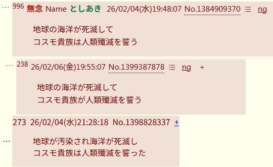 | … | 7426/02/17(火)14:07:27No.1402900454そうだねx2地球の海洋が死滅してコスモ貴族は人類殲滅を誓った |