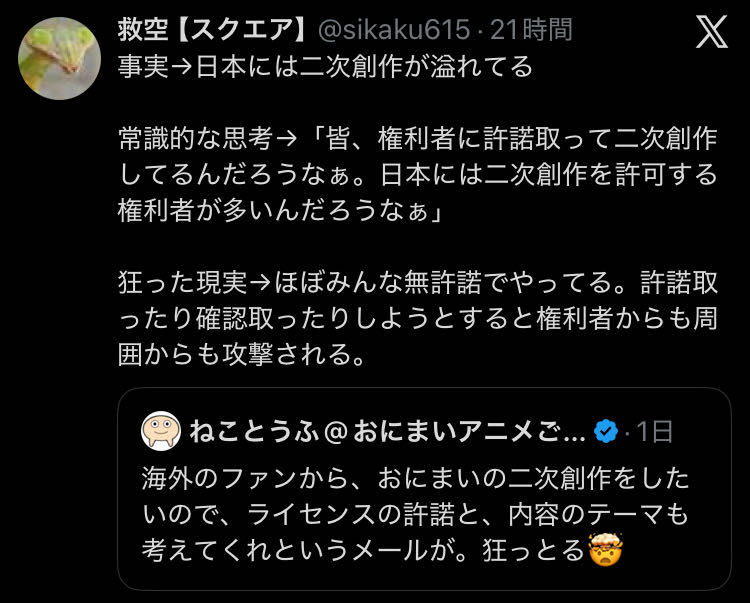 | … | 2526/02/17(火)17:16:16No.1402939374そうだねx23海外だと二次創作が許諾取るの普通みたいな前提で語るのが謎すぎるだろ |