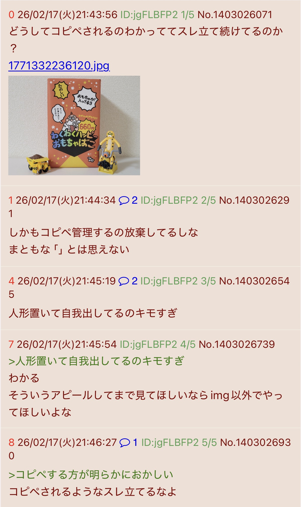 | … | 13026/02/17(火)22:18:45No.1403038610+わくわくハッピーおもちゃばこアンチ初めて見た |