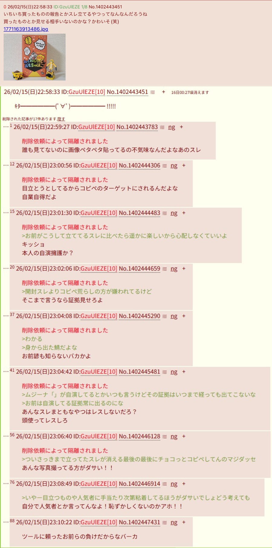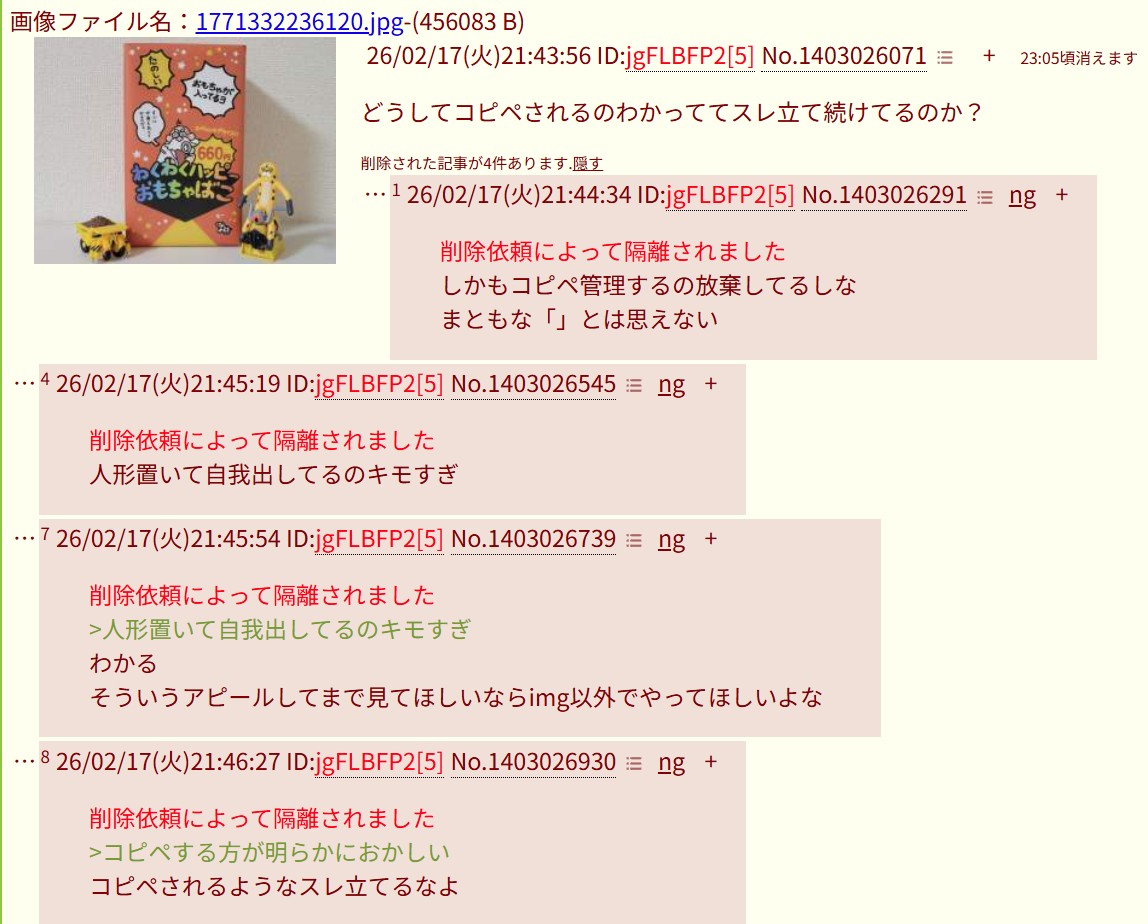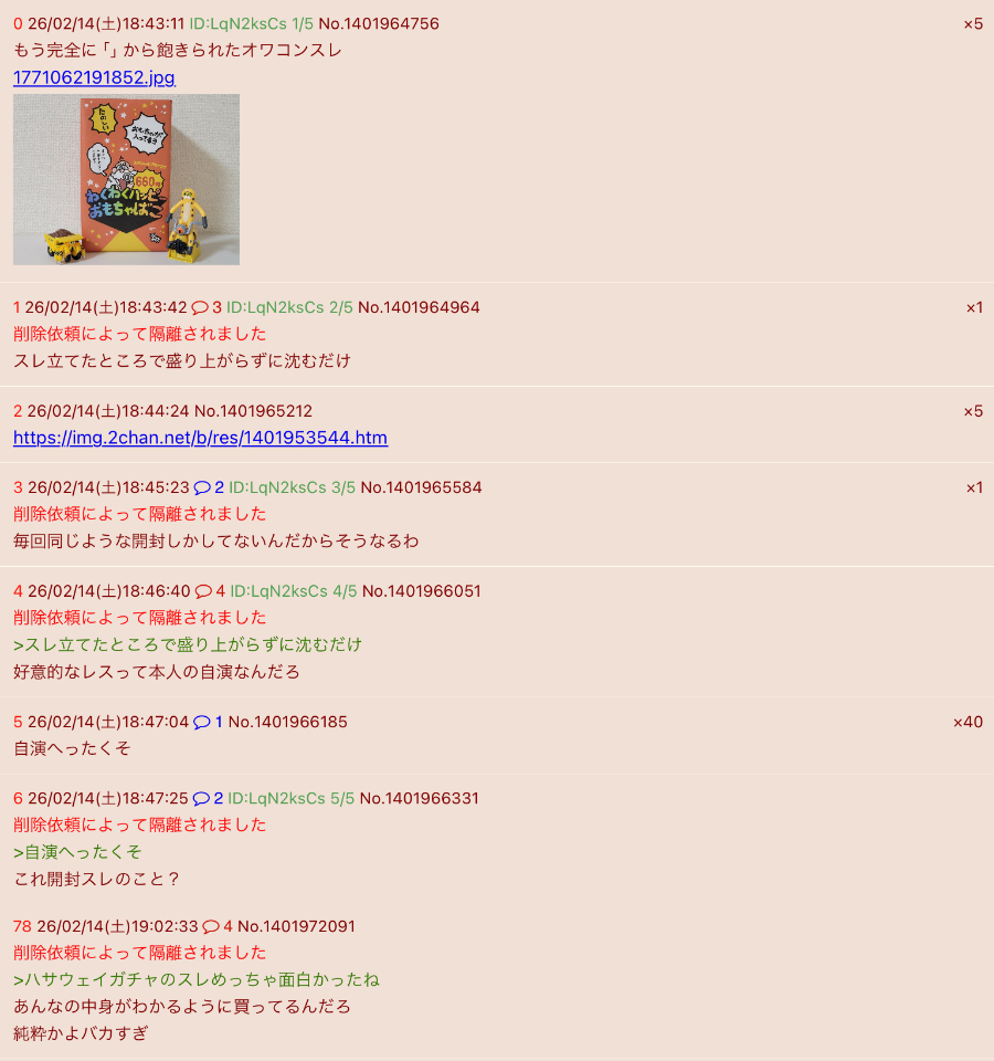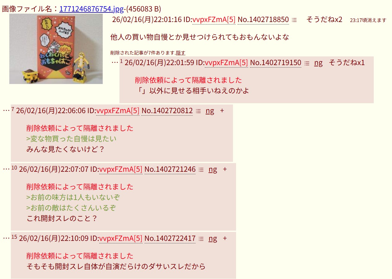 | … | 126/02/17(火)21:44:34 ID:jgFLBFP2No.1403026291+削除依頼によって隔離されました |