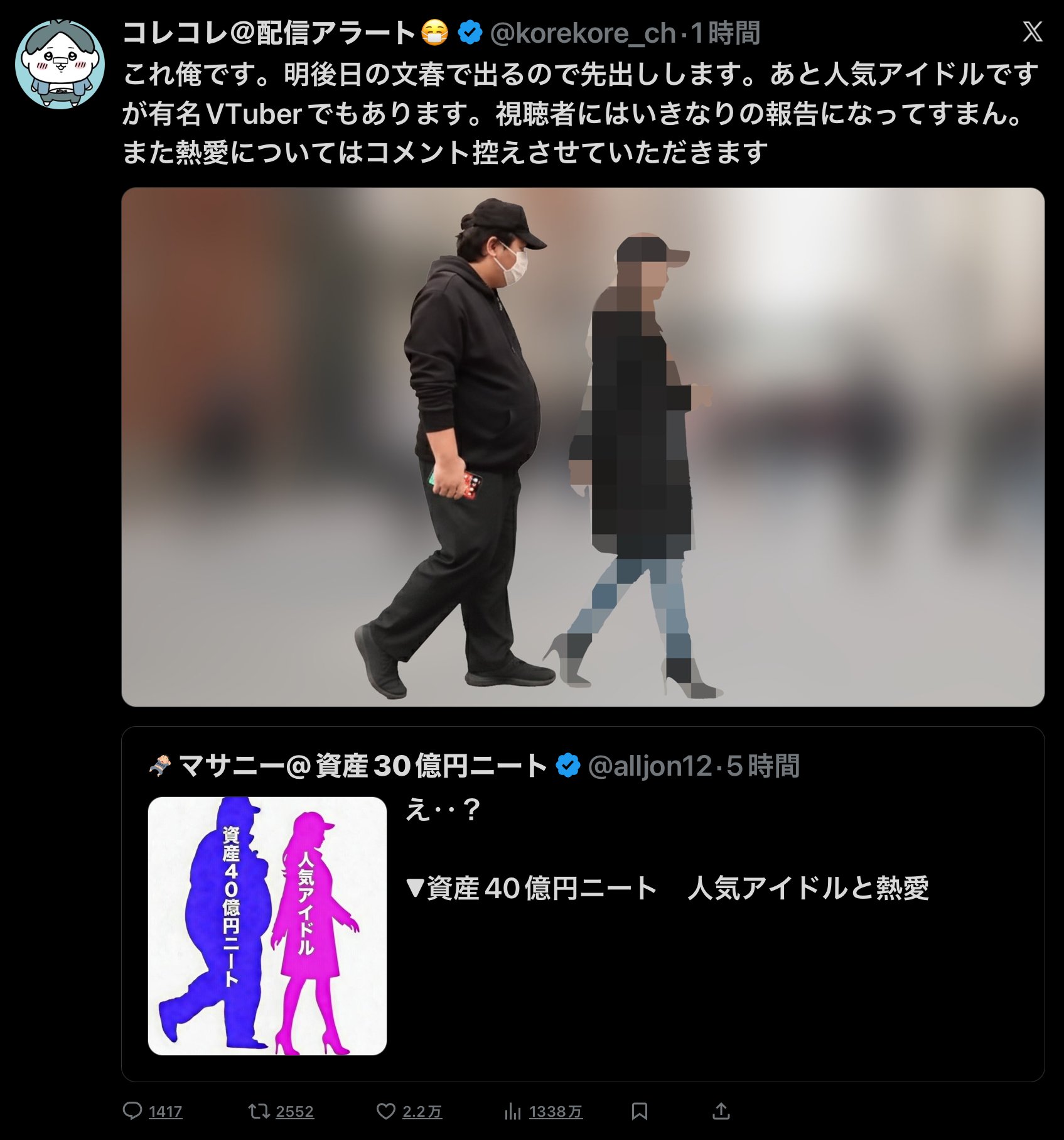 | … | 1526/02/18(水)00:39:28No.1403085607そうだねx5お相手からの公開許可も得たってあるから顔出ししてないVの可能性は無いよ |
