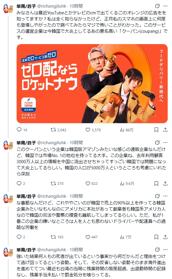 | … | 1526/02/18(水)04:07:40No.1403108386+アメリカ系のサービスって聞いてたけど韓国系だったのかロケットナウ |