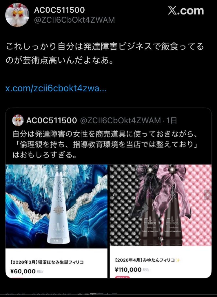 | … | 1026/02/18(水)06:30:01 ID:kICcLxzINo.1403112963そうだねx17>この人がそれをやってたって情報全くないのにこういうストーリー勝手に作ってるチー牛が大勢いるんだからやはりXでやるのはやめた方がいいな |
