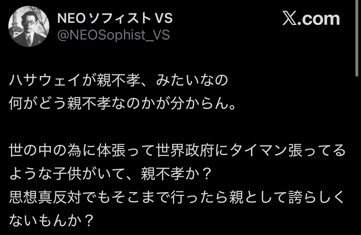 | … | 8726/02/18(水)12:41:10No.1403170424そうだねx1>だからイデオロギー同じでも違ってても先に死んでる・死ぬようなことしてるのが親不孝なのに |