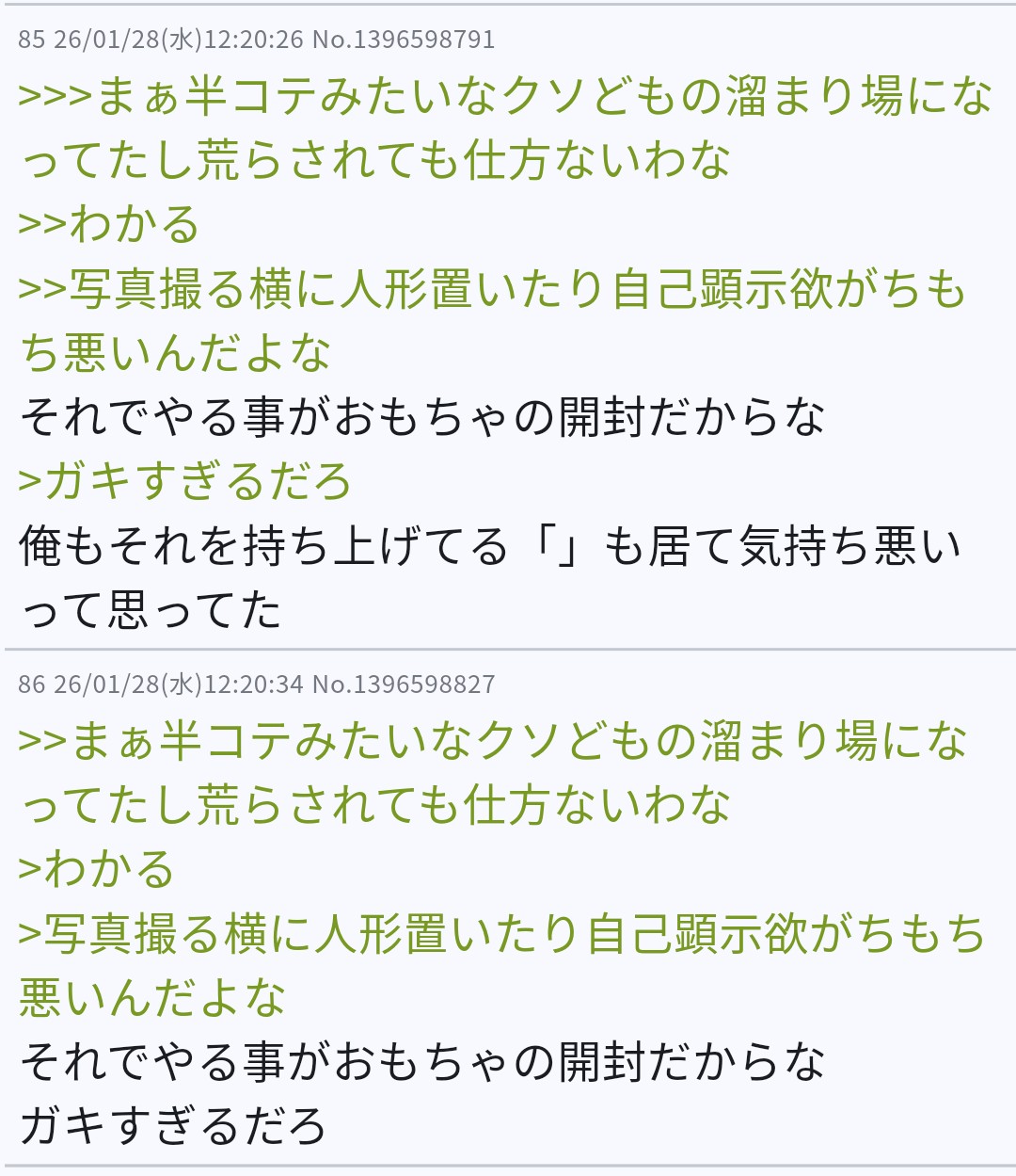 | … | 526/02/18(水)19:44:02No.1403270599そうだねx18匿名なのをいい事に荒らす奴より下はいねえよ |