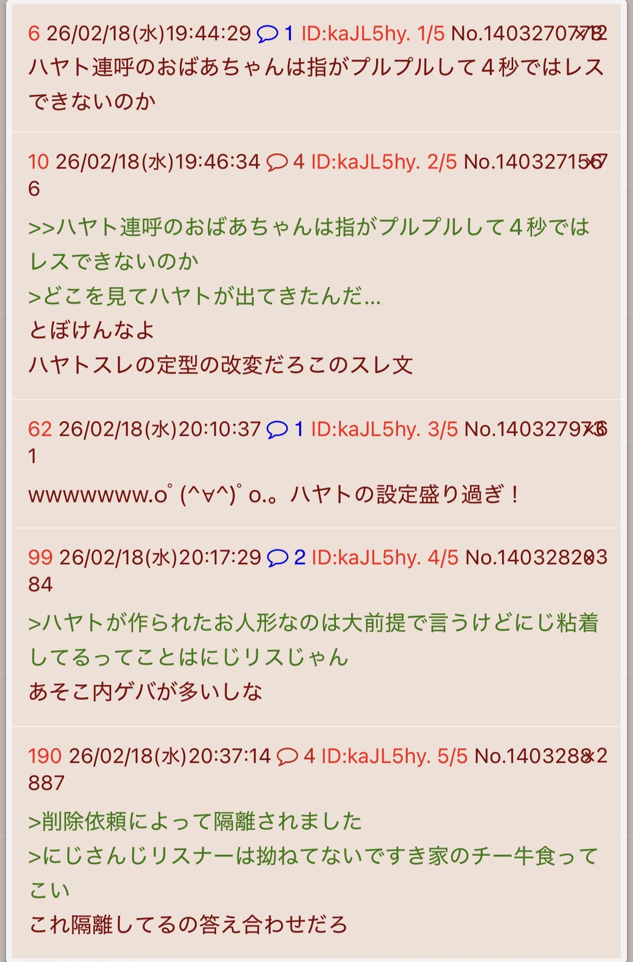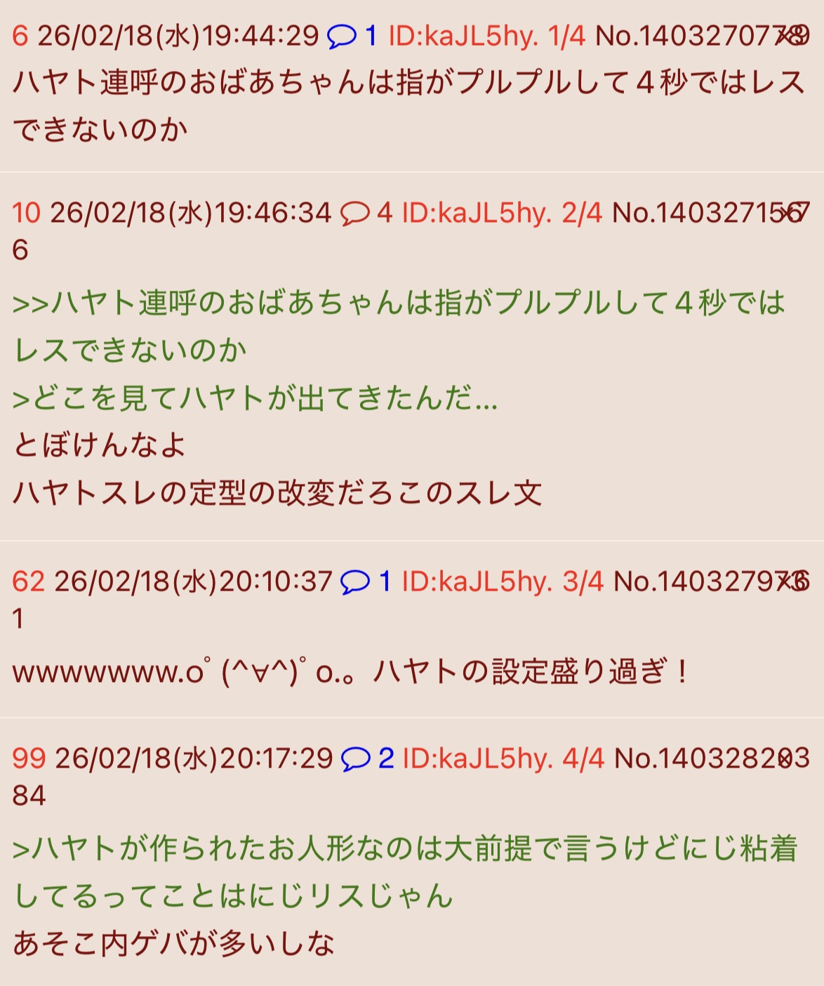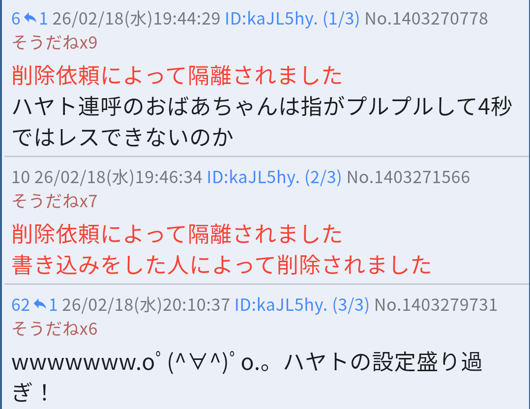 | … | 726/02/18(水)19:45:18No.1403271070そうだねx20>ハヤト連呼のおばあちゃんは指がプルプルして4秒ではレスできないのか |