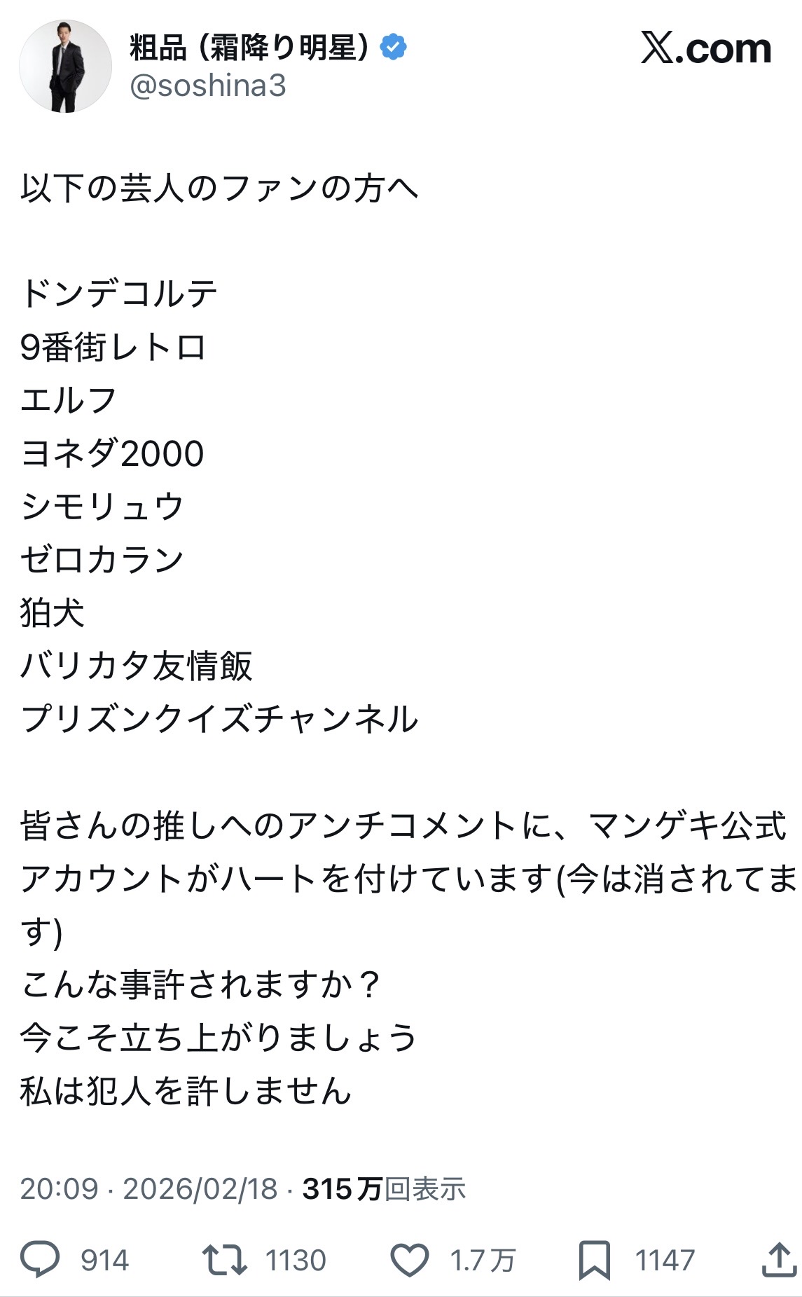 | … | 1626/02/18(水)23:00:43No.1403341515+別にファンを煽動するのは良いんだけど具体的に何して欲しいのか言わないとマンゲキに脅迫DMとかスタッフの個人情報晒しとか始まるからその辺だけちゃんとしてね |