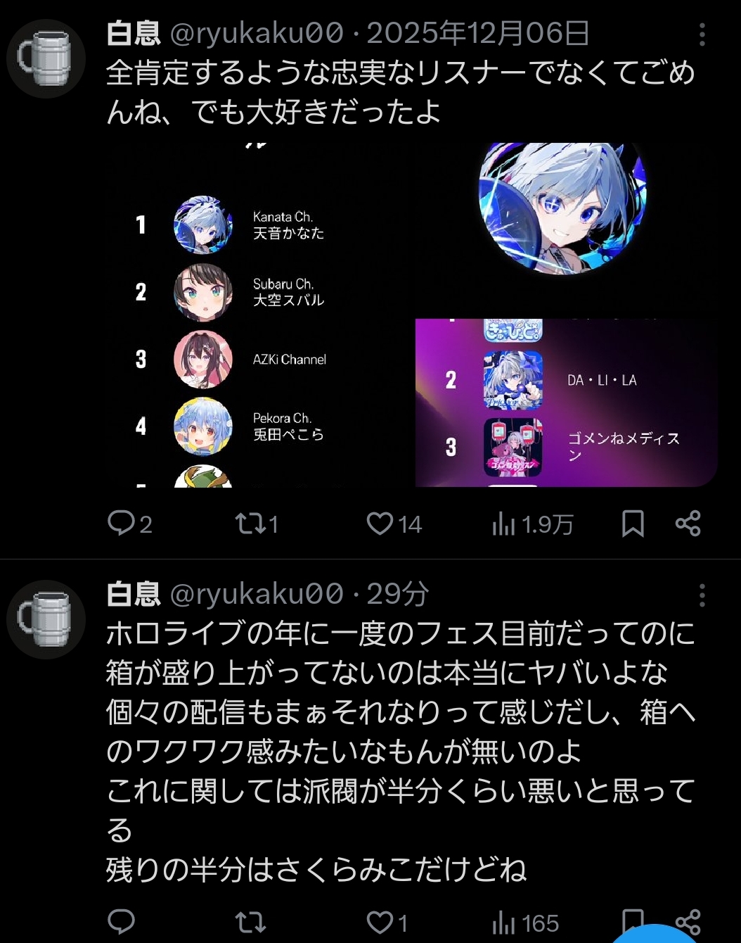 | … | 97826/02/19(木)04:30:49No.1403395373+>>ファンと言うかはホロライブ的にはガイドライン守れてない奴だからNOだろうな「見てる人」ではある |