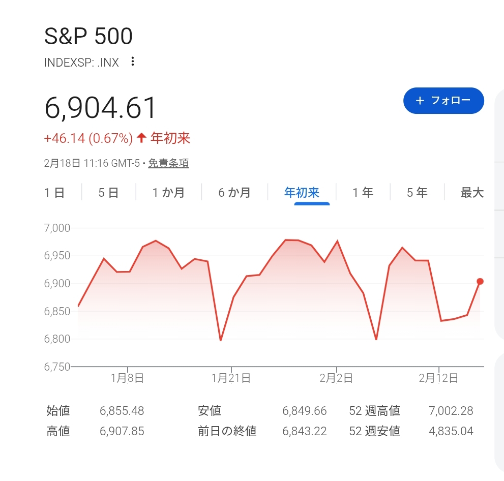 | … | 2826/02/19(木)00:54:42No.1403375524+S&P500が6900に戻ってくれて一安心 |