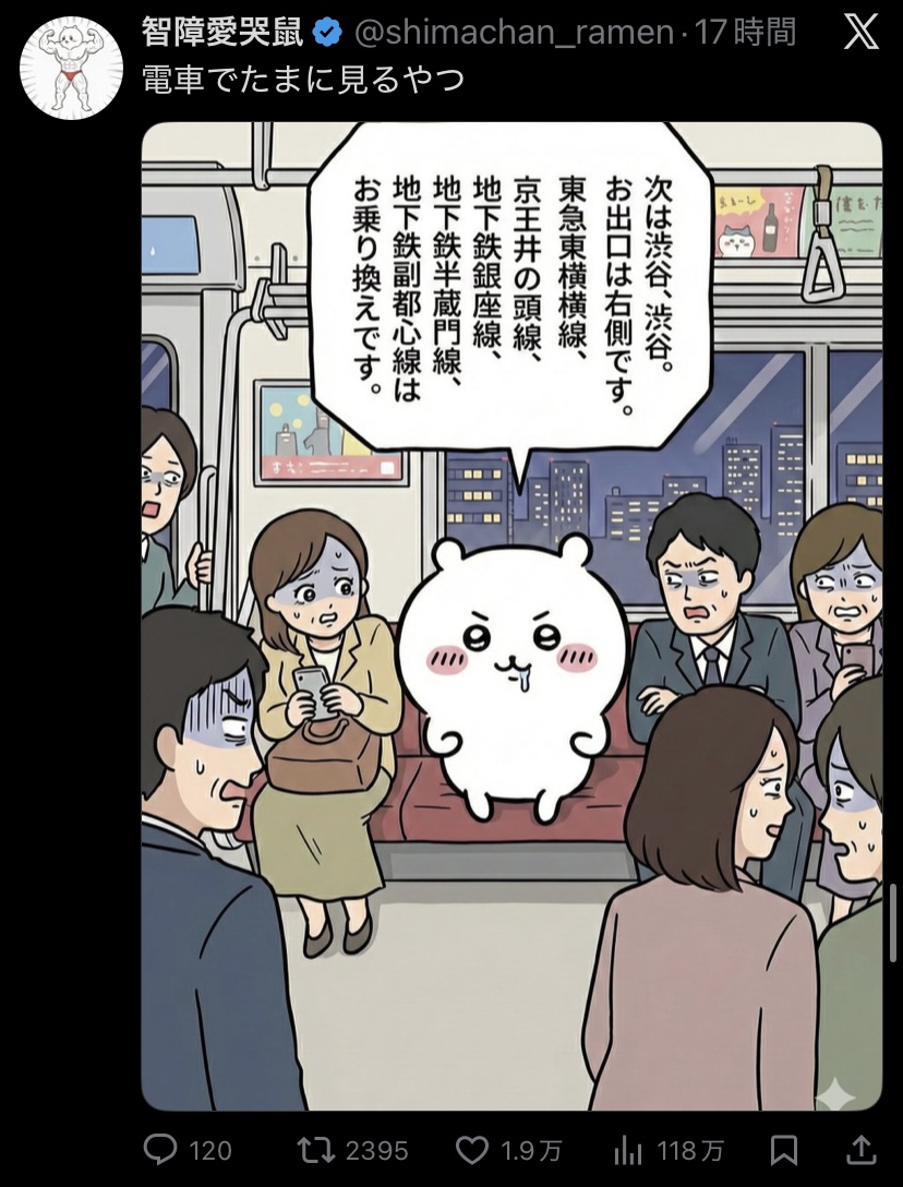 | … | 526/02/19(木)00:35:26No.1403370781+The next station is Shibuya. The doors on the left side will open. Please change here for the Tokyu Toyoko line, the Tokyu Den-entoshi line, the Keio Inokashira line, the Ginza subway line, the Hanzomon subway line, and the Fukutoshin subway line. |