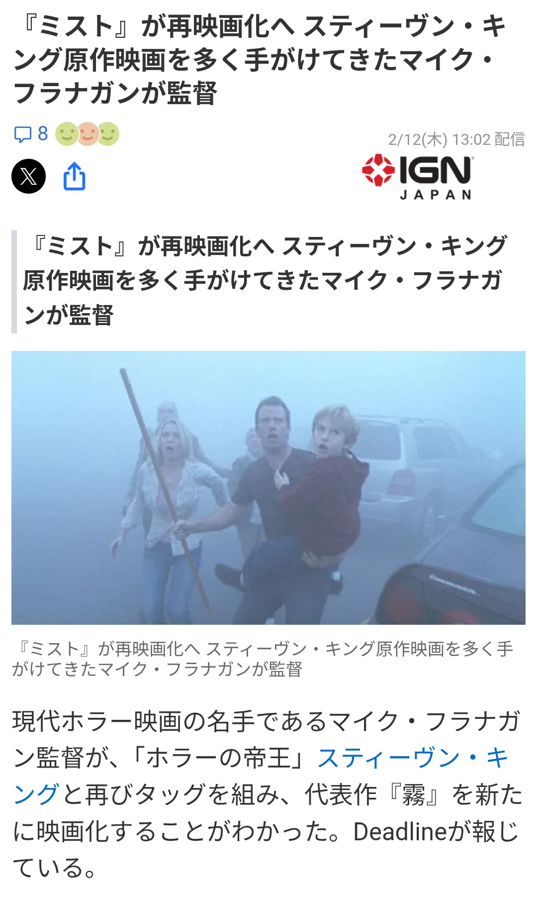| … | 4226/02/19(木)14:28:48No.1403478677+シャイニングの翻案はダメでミストの翻案は褒めてるのがよくわからないキング |