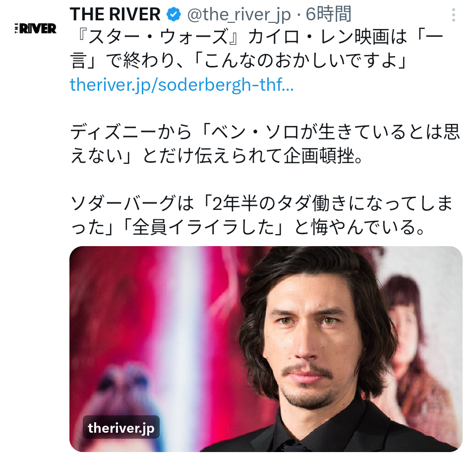| … | 8926/02/19(木)21:06:49No.1403583325+>2021年にアダムドライバーが映画監督のスティーヴン・ソダーバーグに「ベン主役の映画やりたい」って持ちかけて |