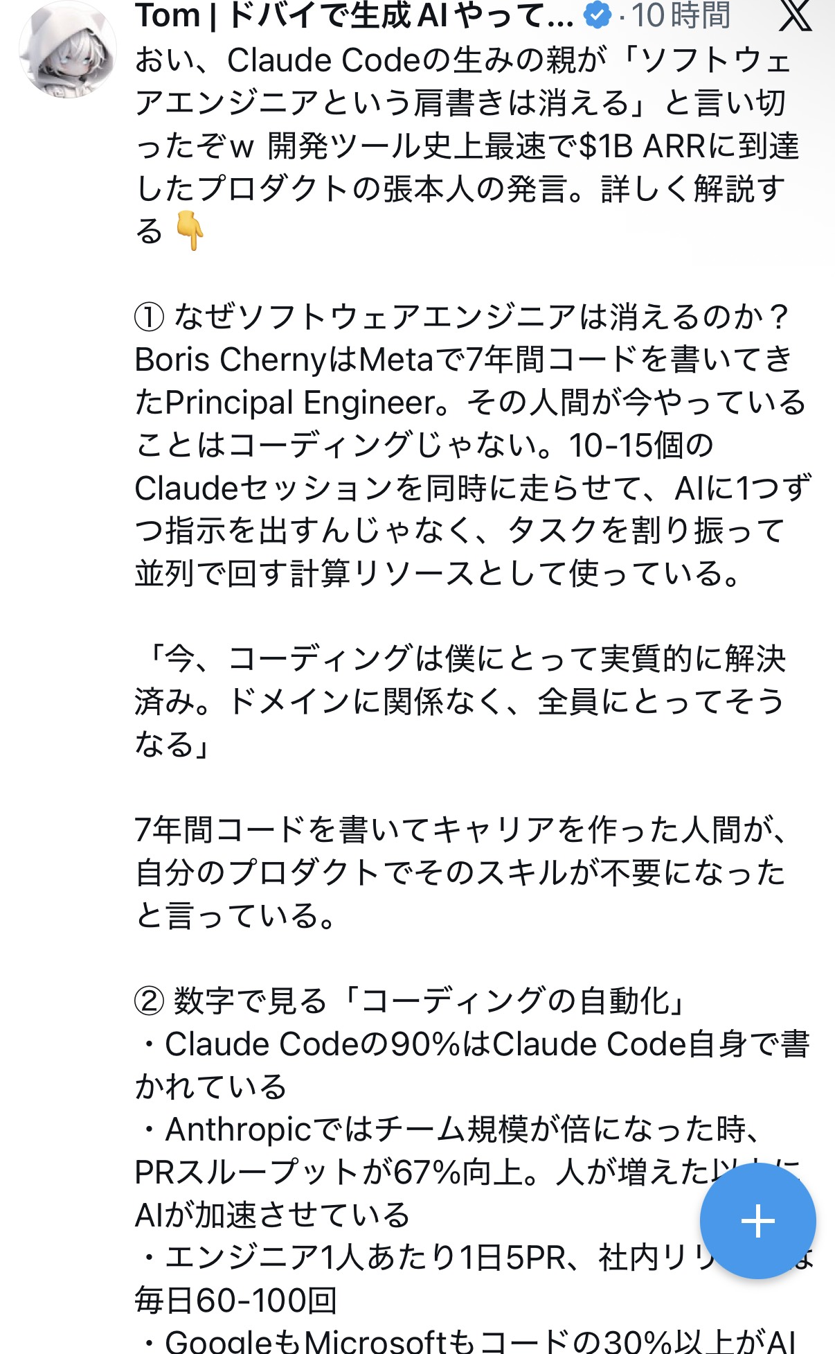 | … | 5726/02/19(木)23:17:33No.1403632033+>エンジニアやってるけど別にコード書きたいわけではないから今の流れは俺は歓迎なんだが |
