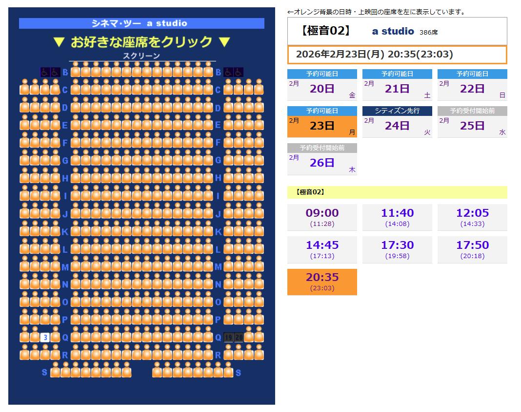 | … | 41226/02/20(金)01:20:34No.1403664296+席は結構簡単に取れるよ23時30〜40分ぐらいから始まる待機列に並ぶだけ |