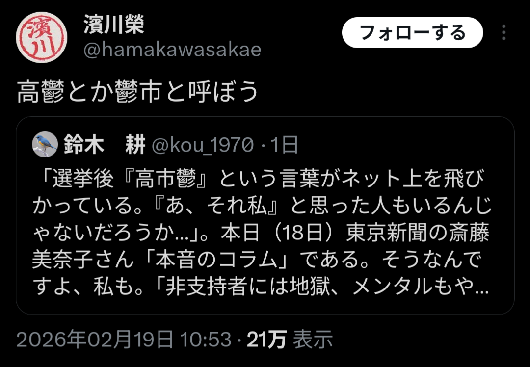 | … | 11326/02/20(金)07:57:32No.1403692259+>>高市もブログ消したり意地悪云々確かにアレなだし悪口じみた批判してもお互い様だけど |
