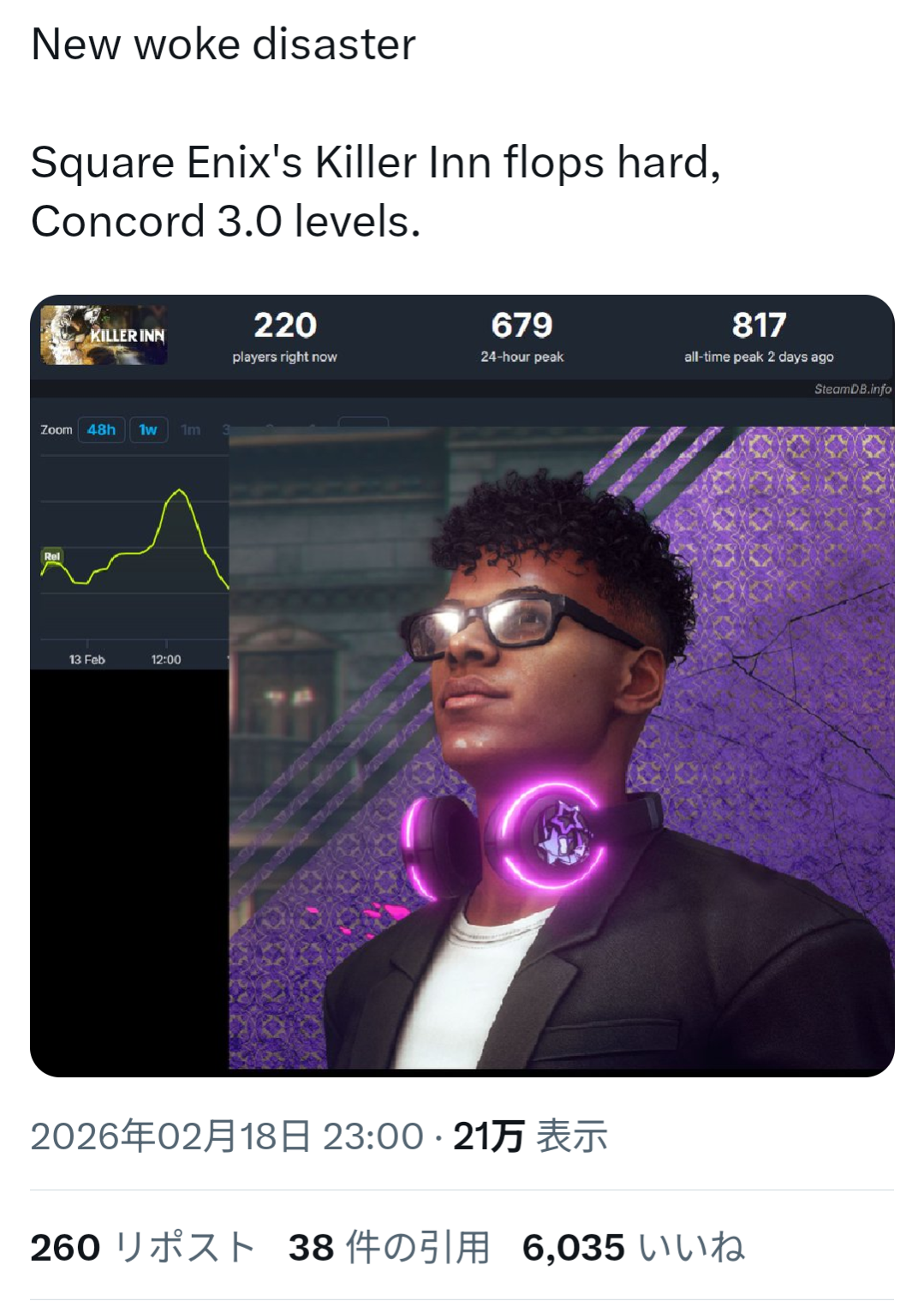 | … | 1126/02/20(金)16:49:55No.1403793543そうだねx6>だからポリコレとか関係なくゲーム性がカスだから凋落してるだけだっつってんだろ |