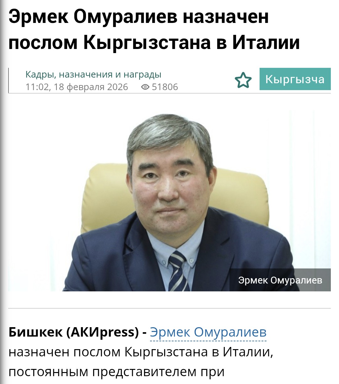駐イタリア大使に任命されたキルギス共和国のエルムク・オムラリエフ氏