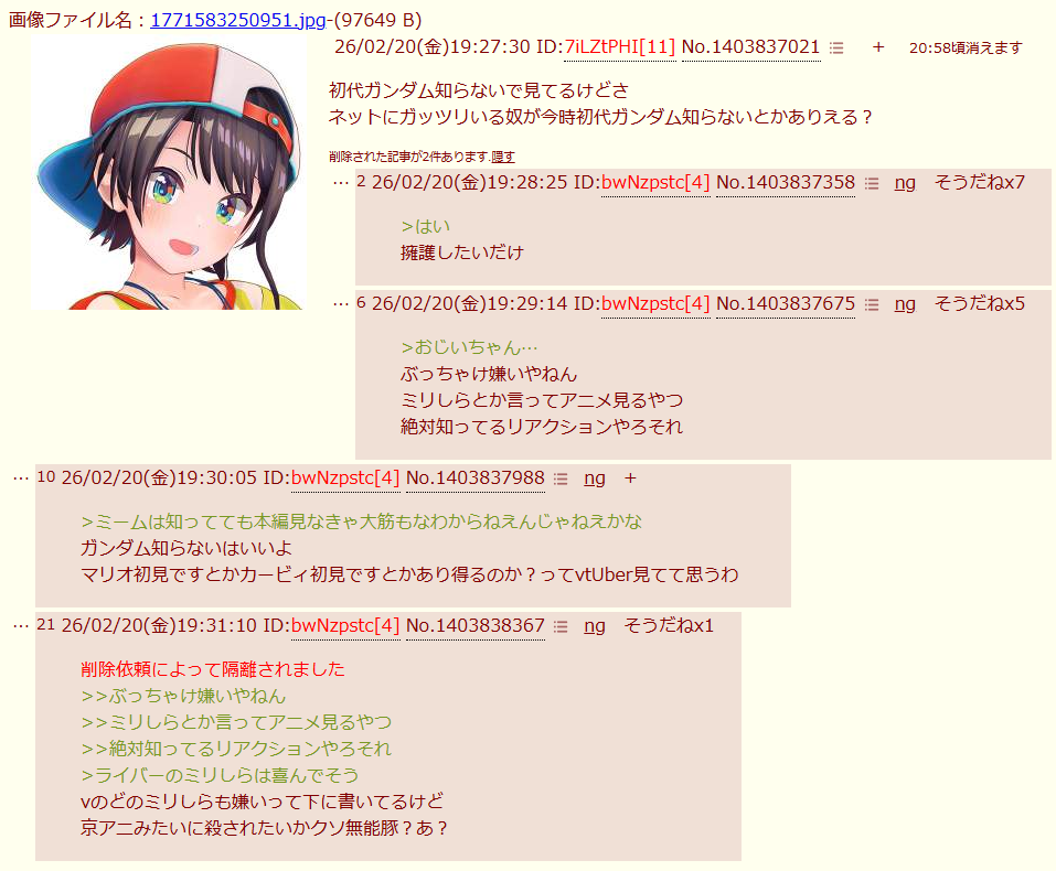 | … | 32026/02/20(金)19:58:14No.1403847923そうだねx3>ただVを叩きたいだけのスレなのにマジレスするのは空気読めてなさすぎる |