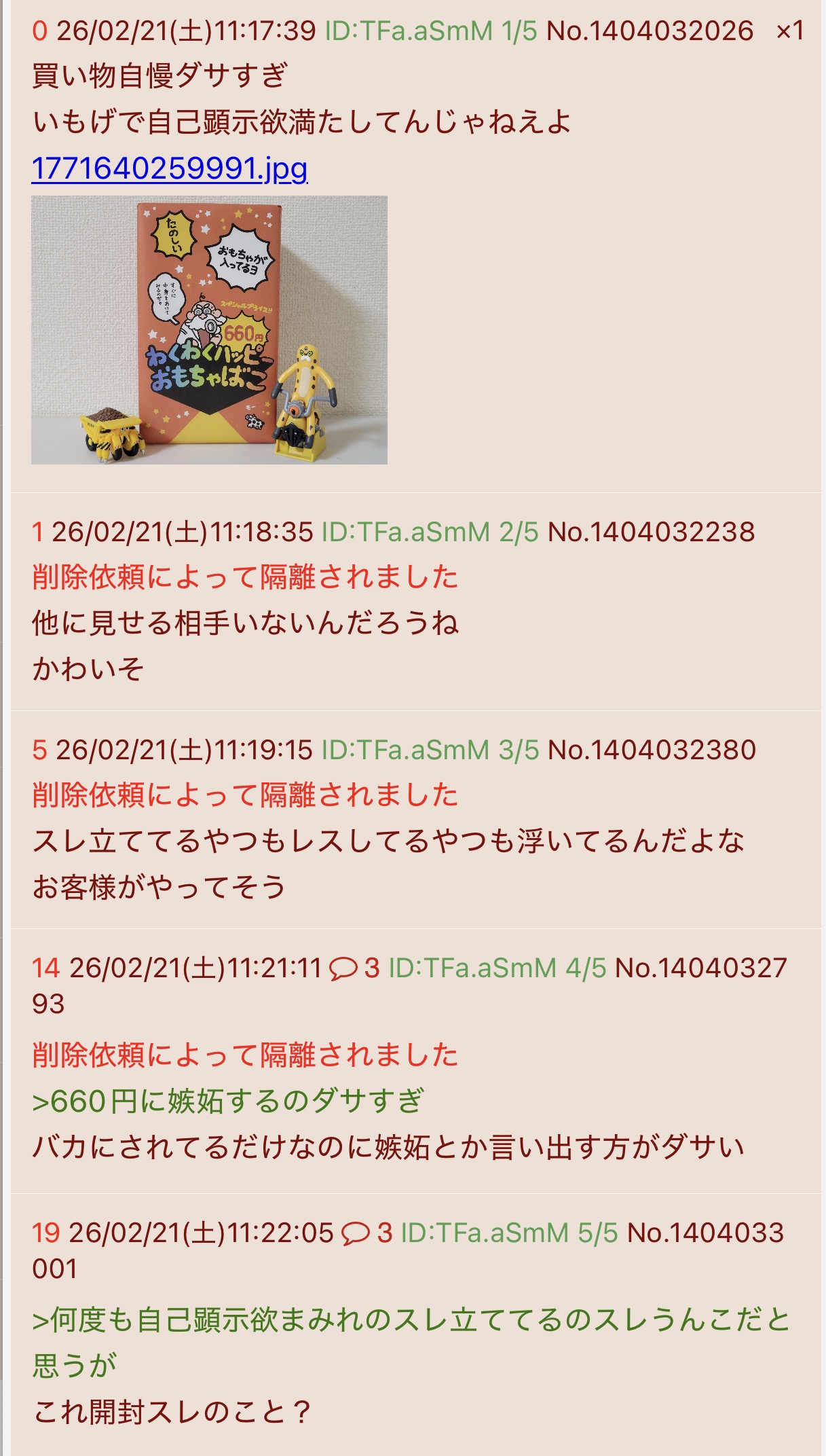 | … | 2026/02/21(土)11:22:06No.1404033003そうだねx3わくわくハッピーおもちゃばこ作った人が立ててるのかなこのいつもの粘着スレ |