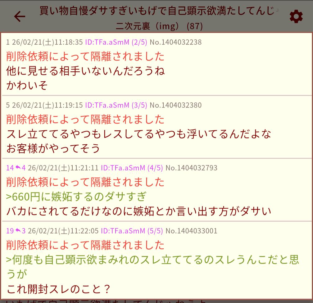 | … | 126/02/21(土)11:18:35 ID:TFa.aSmMNo.1404032238+削除依頼によって隔離されました |