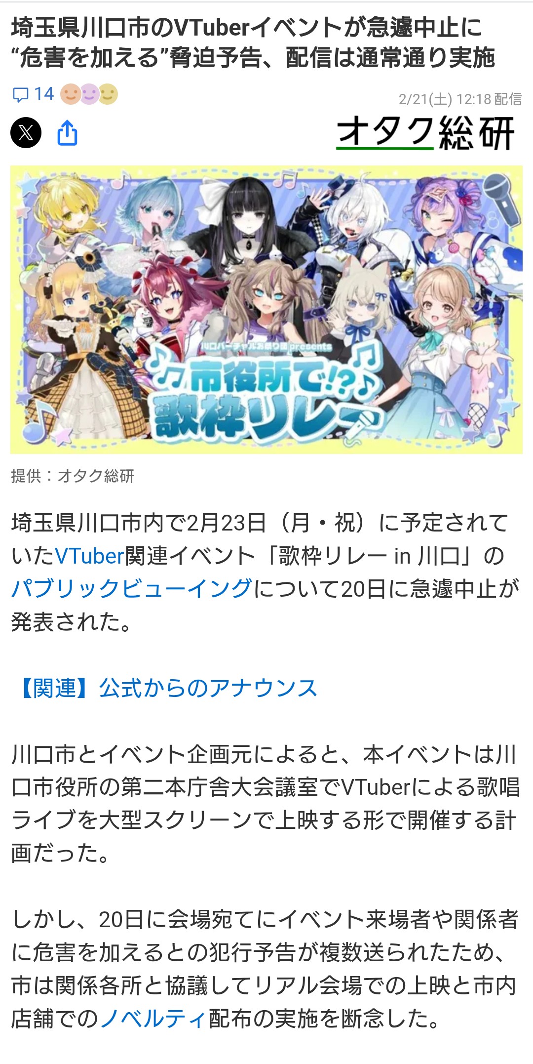 | … | 19226/02/21(土)15:25:26No.1404093838そうだねx3危害予告出した連中が咎められてるだけなのになんでそこでVの対立煽りがって言っちゃうんですか… |