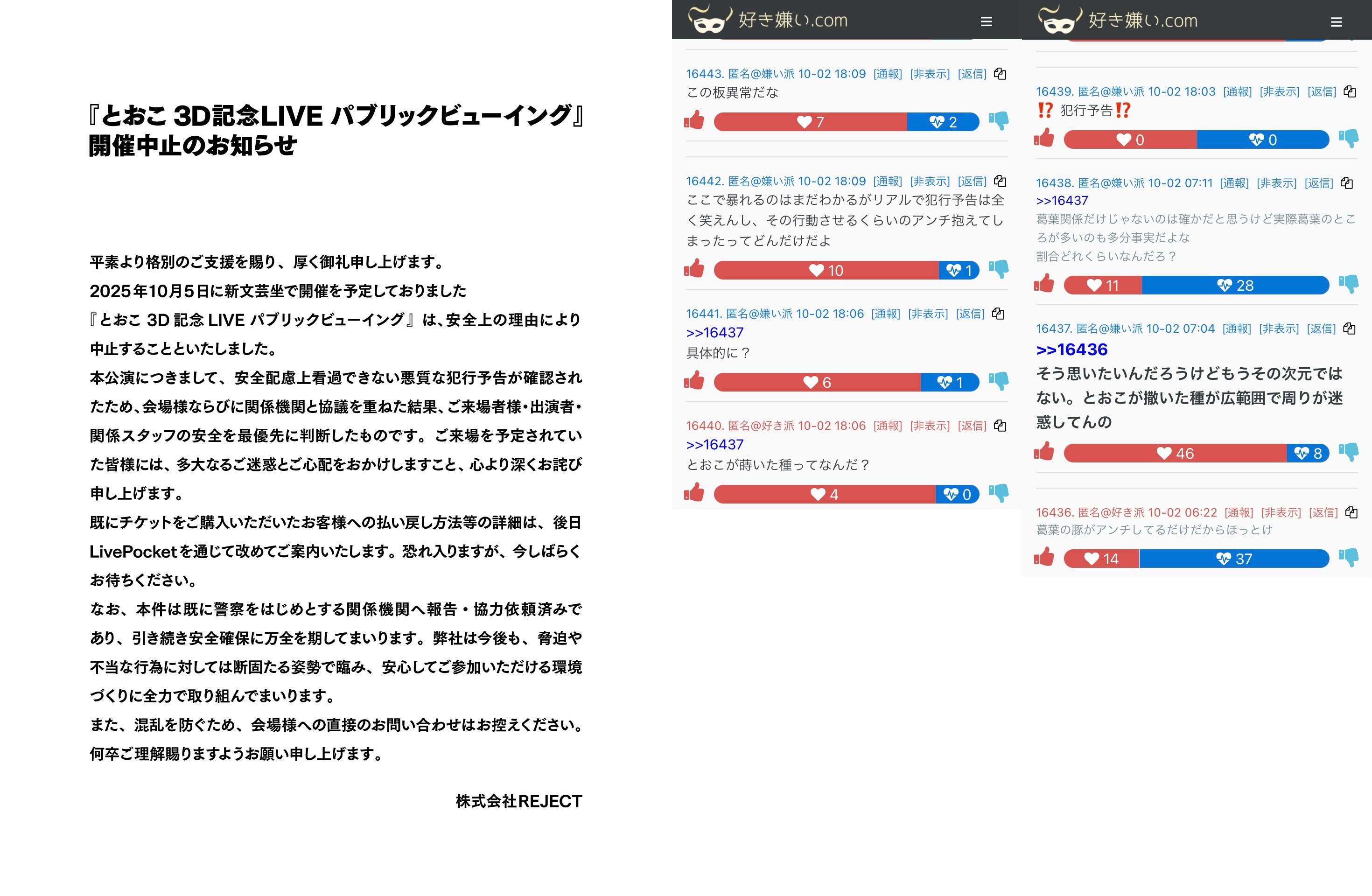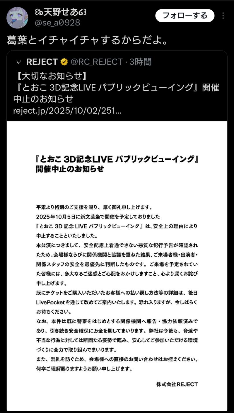 | … | 23026/02/21(土)15:34:22No.1404096219+今日だけでヒで3件くらい脅迫でのイベント中止みたけど流行ってんの? |