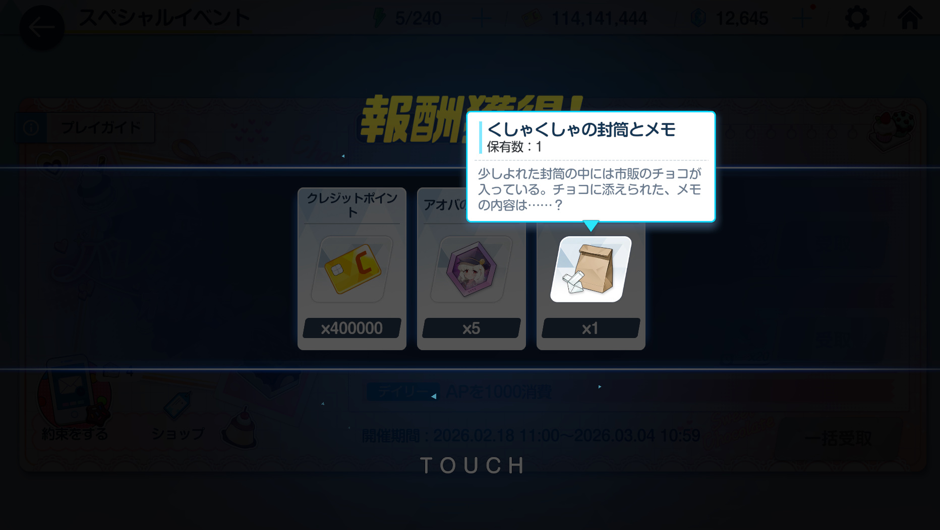 | … | 93426/02/21(土)14:47:34No.1404084576+貰えるチョコの子のモモトークを消化してチョコは貰いきった…残りのモモトークはゆっくり読もう… |