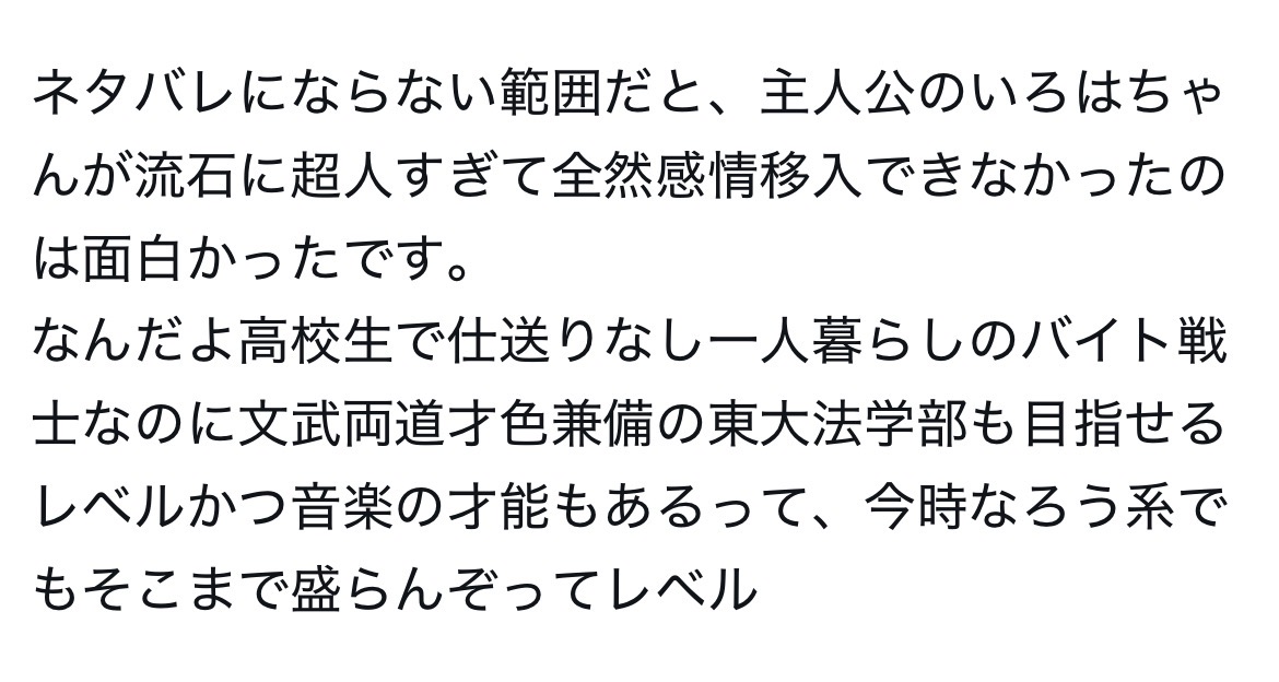| … | 5526/02/21(土)14:30:21No.1404080363+キャラクターのリアリティとかは主題じゃないもんなあ |