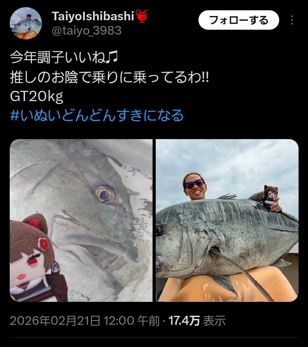 | … | 3226/02/21(土)15:57:13No.1404102609そうだねx20俺だってこのサイズのGT釣ったらそりゃ満面の笑顔になる |