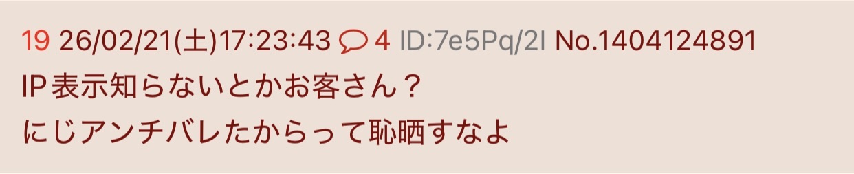| … | 5726/02/21(土)18:03:07 ID:.Kp8DJBINo.1404135049+>imgでIP表示!? |