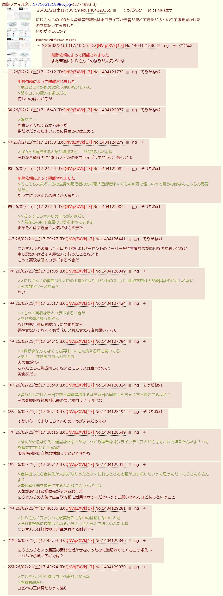| … | 826/02/21(土)17:49:38 ID:tbZ2WalMNo.1404131505そうだねx6>にじさんじのほうが人気という事実が彼らを狂わせるのだ |