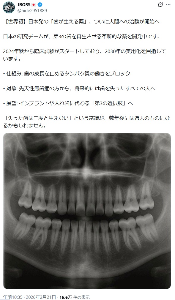 | … | 14226/02/21(土)19:47:39No.1404171337+先天的に無歯だった人を救えるだけじゃなく |
