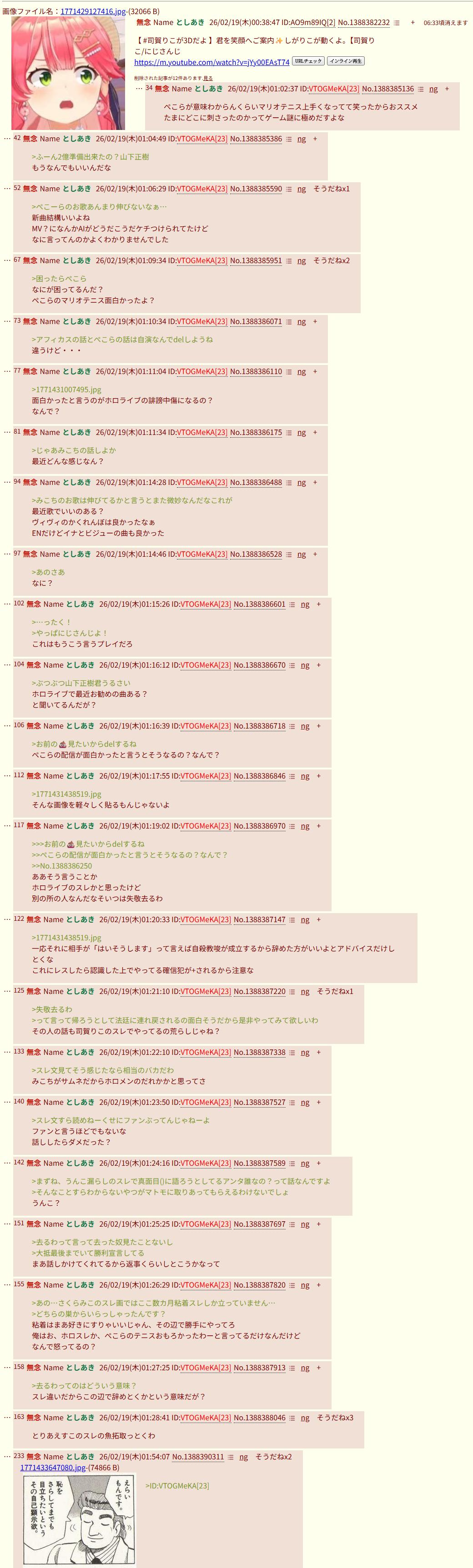 | … | 2426/02/21(土)20:11:22 ID:P20TwS5cNo.1404180758+今年のTDに怪文書が貼られるかどうかで誰が原因かわかりますめえ |