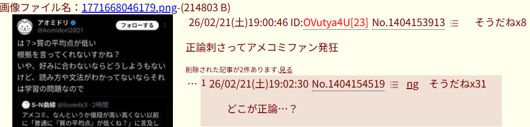 | … | 2826/02/21(土)20:12:55 ID:w0QKECWkNo.1404181370そうだねx1>コピペならせめて特殊重心にしてくれと思った |