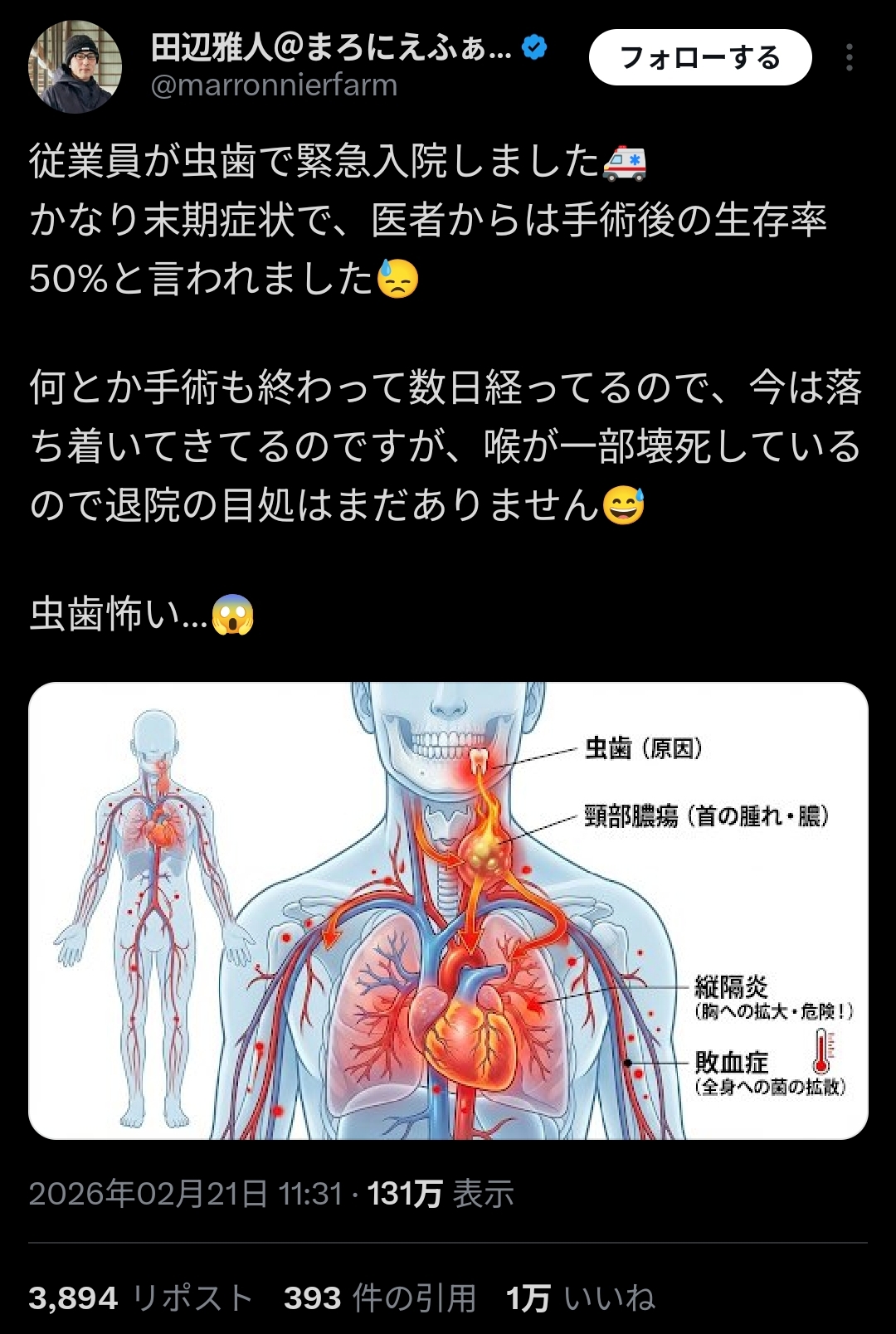 | … | 926/02/21(土)21:38:55No.1404215941そうだねx14これ虫歯から首の腫れに到達するまでの過程で結構長い間相当な痛みが出てたのでは!? |