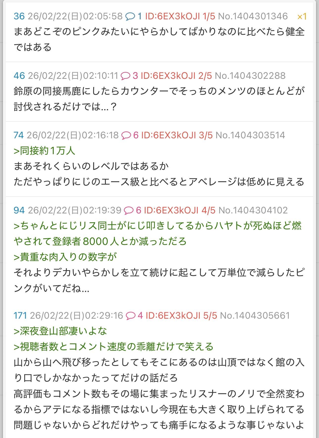 | … | 5626/02/22(日)02:12:17No.1404302712+>深夜に4万見てるのにコメント少ない配信ってどういう配信だよ |