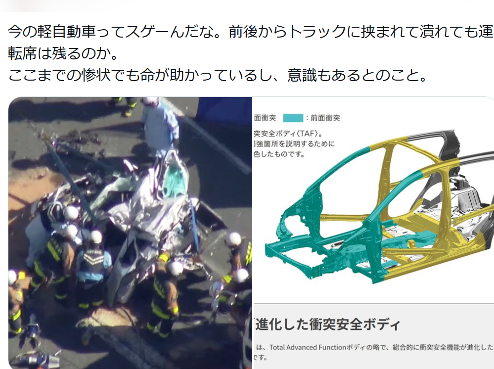 よく軽自動車は棺桶とか危ないから乗るなとか聞くけど最近の事故のニュースやデータを見てると軽自動車も結構安全になったね…ってなるこのスレは古いので、もうすぐ消えます。