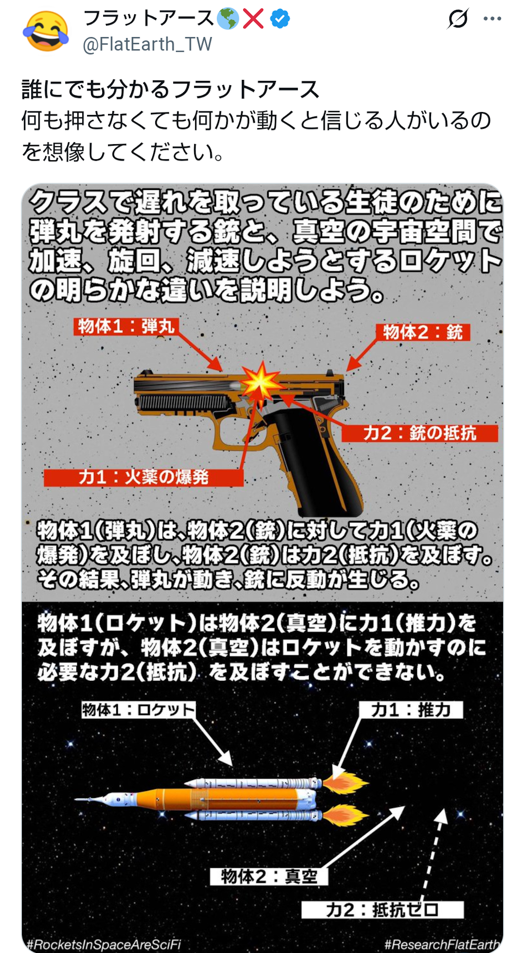| … | 726/02/22(日)11:32:41No.1404378598+これって宇宙でロケットが飛べるはずない!って話だよね?ここからフラットアースに繋がるの? |