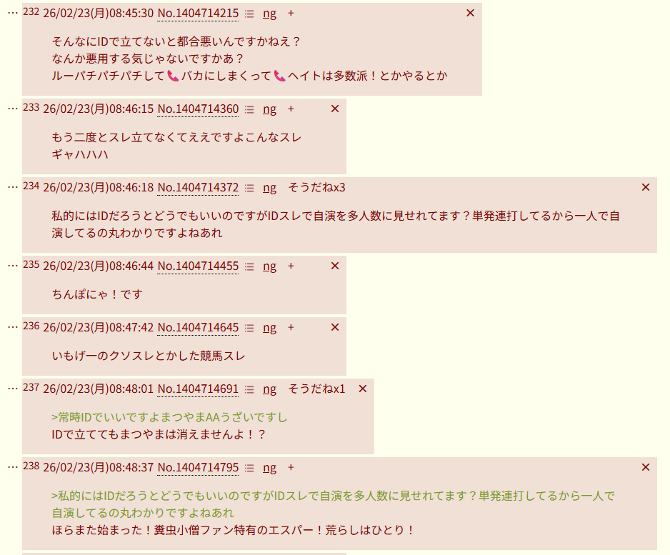 | … | 826/02/23(月)08:58:12No.1404716522+これだけの頻度で立つスレなんだから荒らしも棲みつくでしょう |